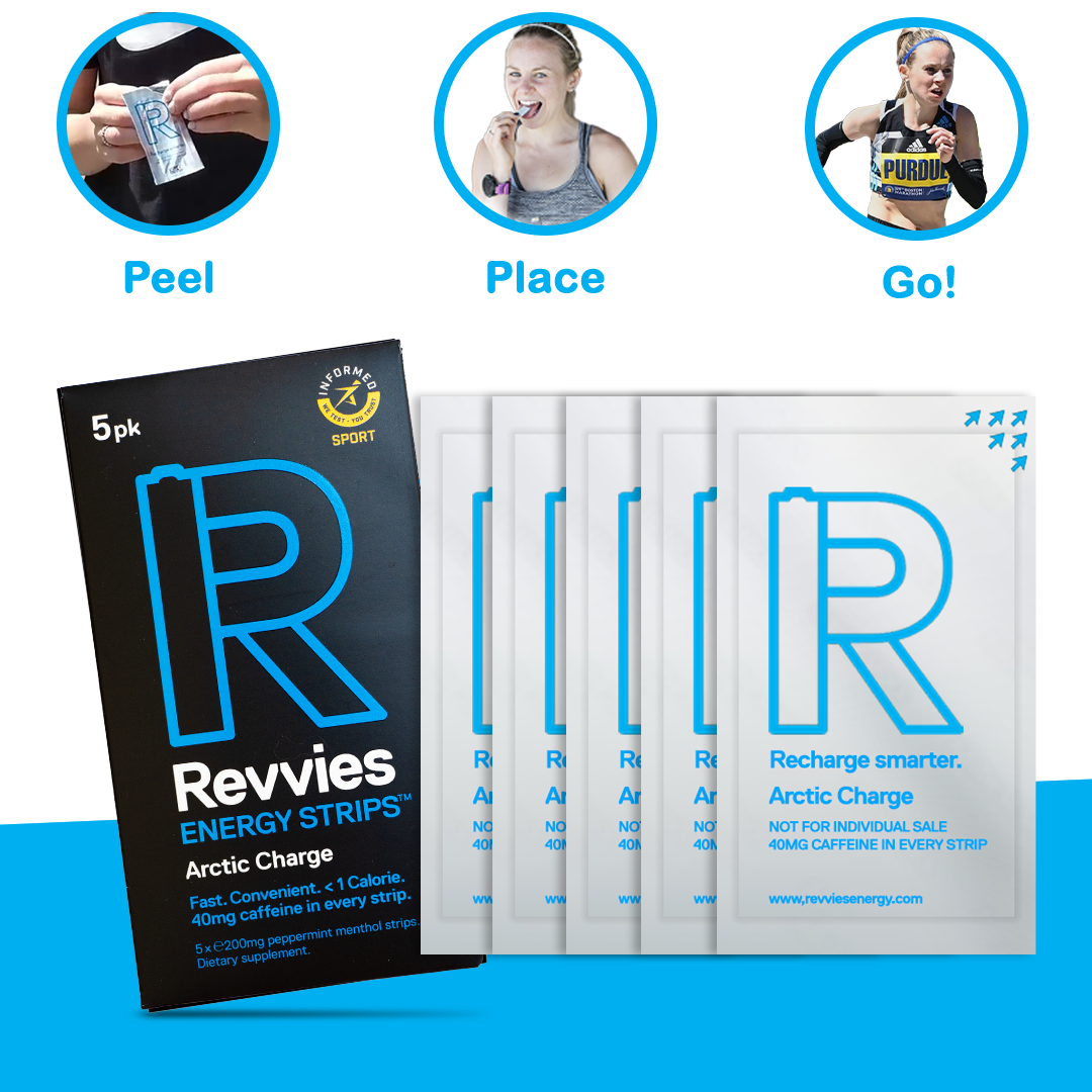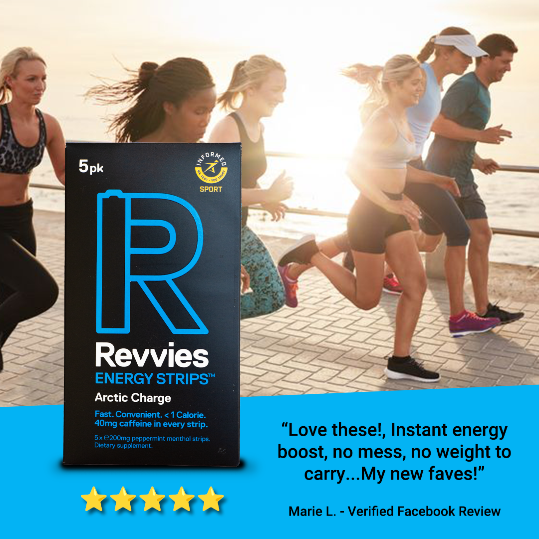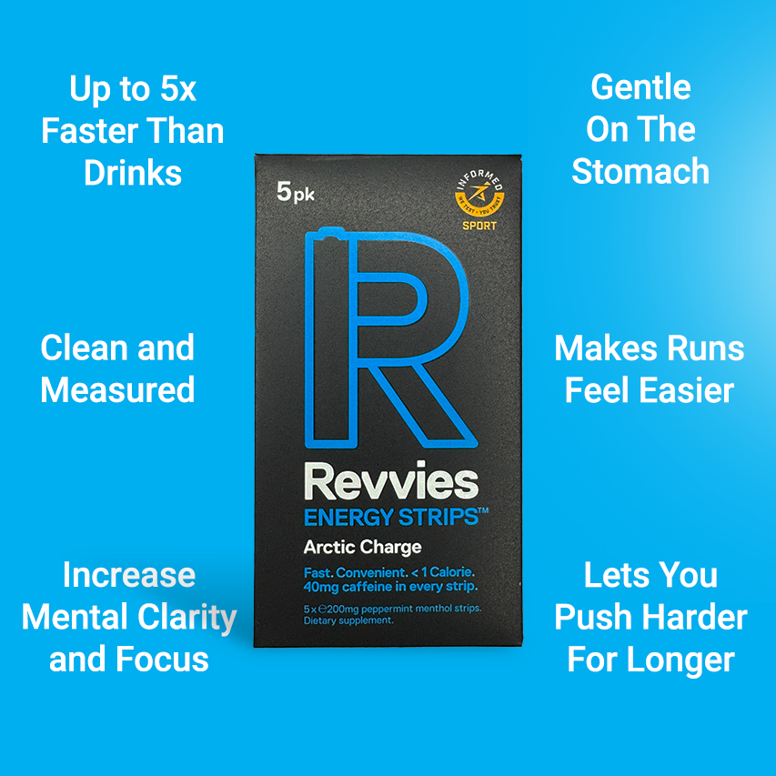 Revvies multi-award-winning energy strips provide a fast-acting boost that’s easy on the stomach. Perfect for making your runs, rides, workouts, and other activities feel easier and more enjoyable, Revvies helps you push harder and sustain peak performance longer in training and on race day.