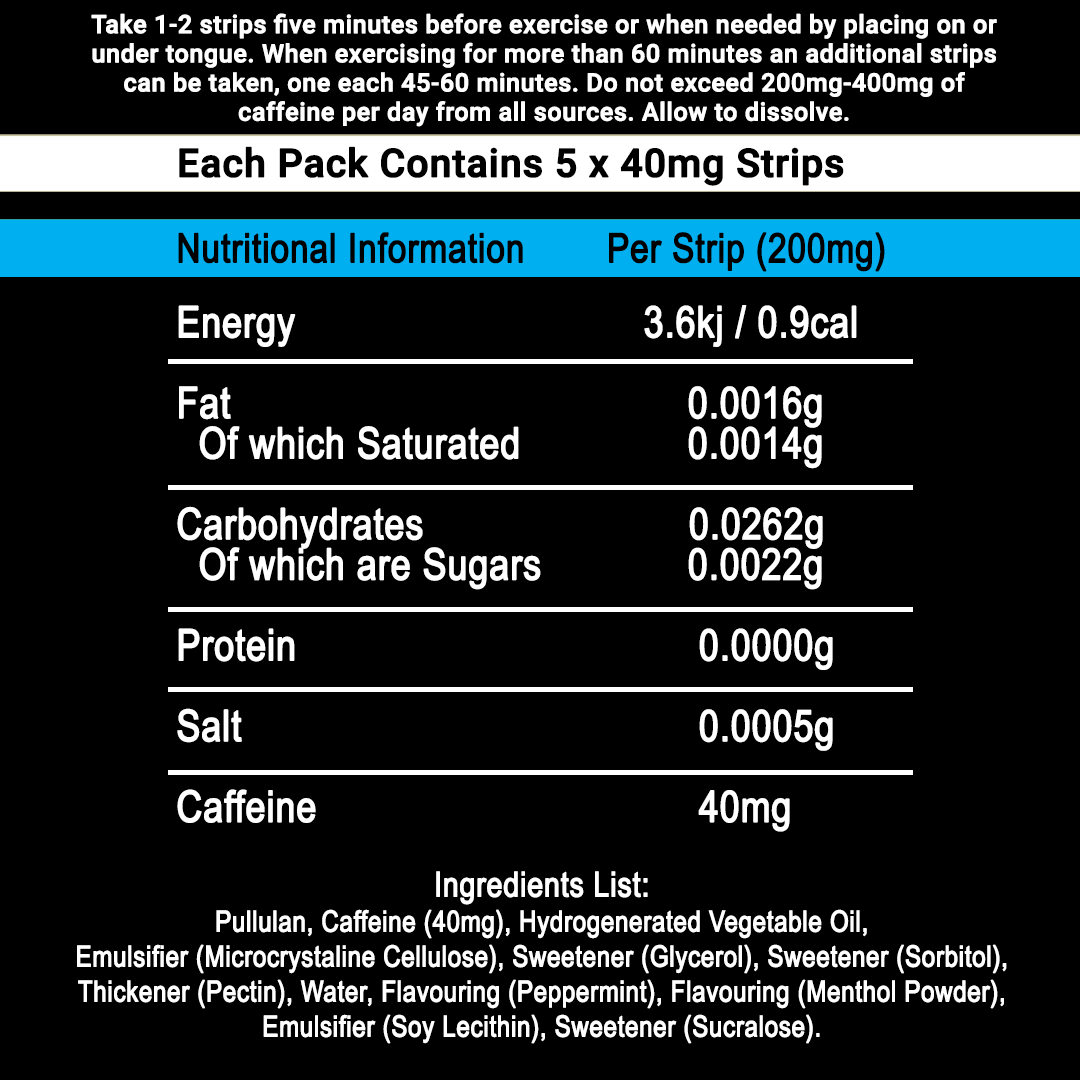 Each Revvies standard strip contains 40mg of caffeine and our extra strength strips contain 100mg of caffeine per strip. Every strip is sugar-free, vegan-friendly, and gluten-free. Use 1-2 strips before exercise and 1 strip every 45–60 minutes during exercise to stay energized and focused, helping you to reach new goals and overcome challenges.