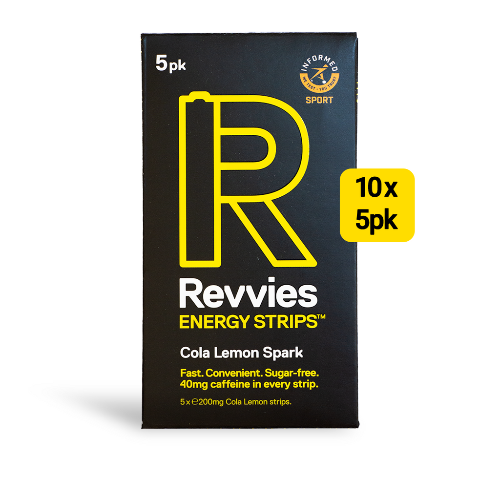 Revvies Cola Lemon Spark provides a great tasting, fast, convenient, sugar-free way to do energy. This bulk pack provides the best value with ten pocket-sized packs each containing five peppermint and menthol strips, with 40mg caffeine per strip (approx. ½ a cup of coffee or ½ a can of an energy drink).
